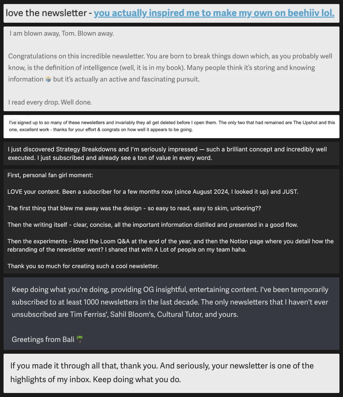 When you say ‘I read every word’ or ‘your newsletter inspired me to start my own’, it yanks me right out of the sub count / open-rate / sponsorships / growth rate / numbers-on-a-screen echochamber.