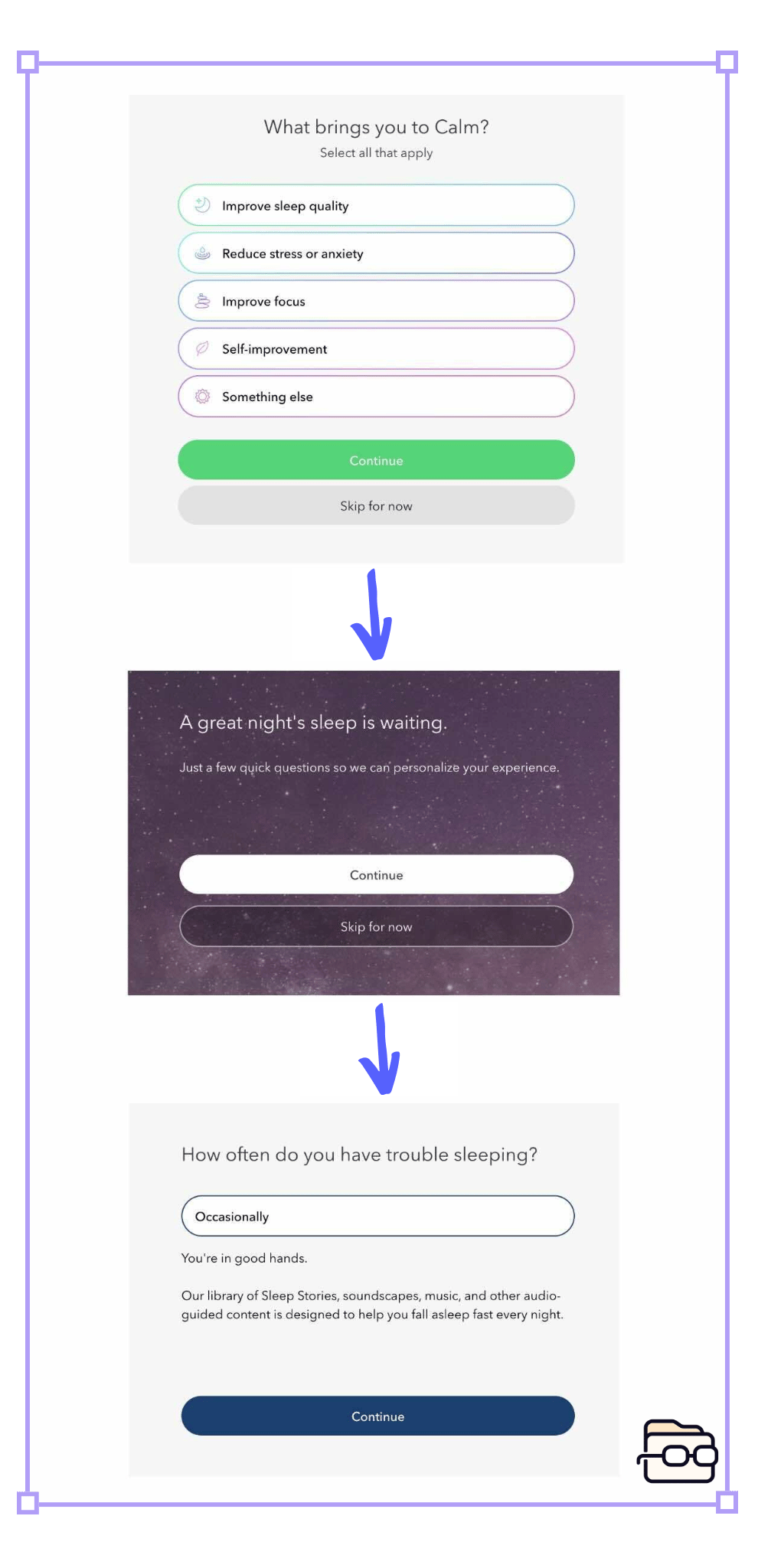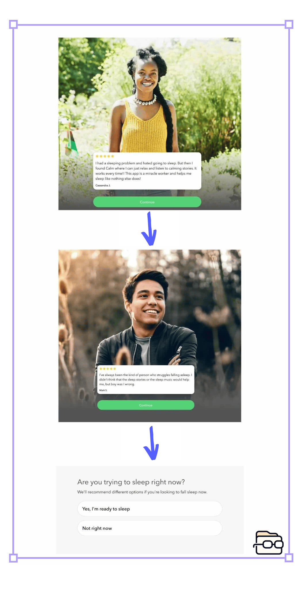 The flow creates momentum with relevant testimonials based on the user’s responses, as well as a sense of urgency by reminding them that they may be looking for a solution (e.g. to fall asleep) right now.
