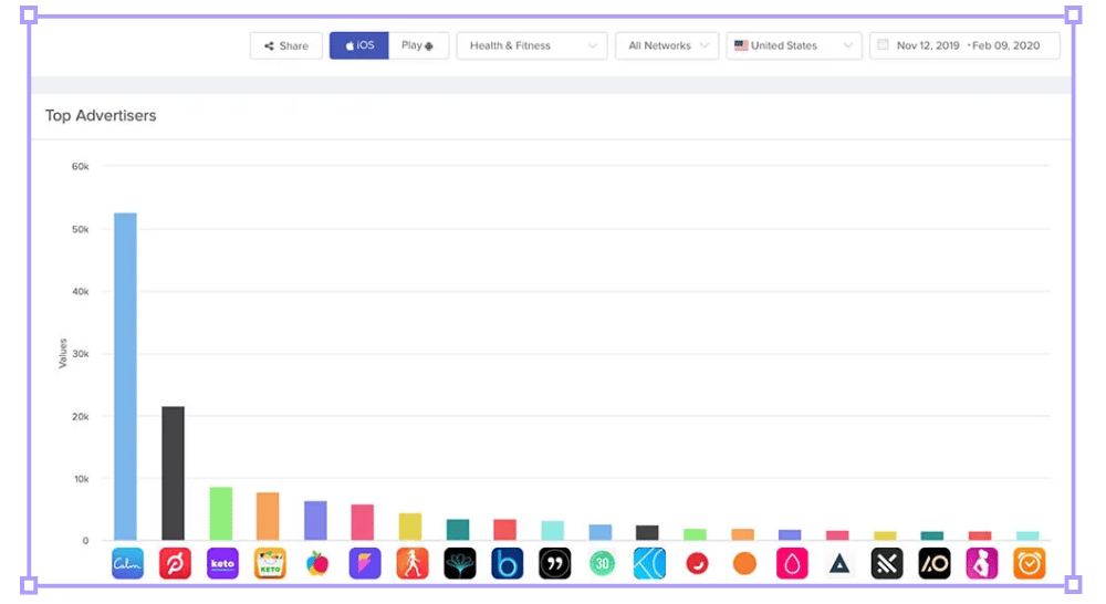 Back in 2020, they had over 300 different Meta ads running simultaneously, and were the highest spenders in the ‘Health and Fitness’ niche on iOS.