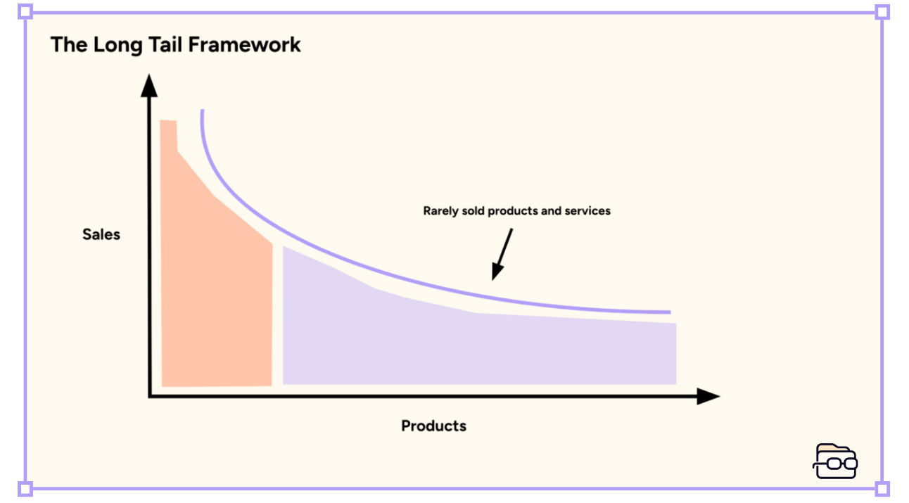 Popularised by writer Chris Anderson in 2006, the Long-Tail Framework suggests that a small number of products and services make up the “head” of the diagram. These offerings are widely popular, highly competitive, and few in number.