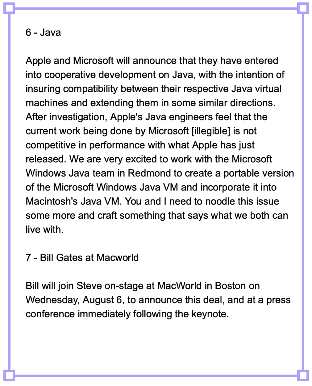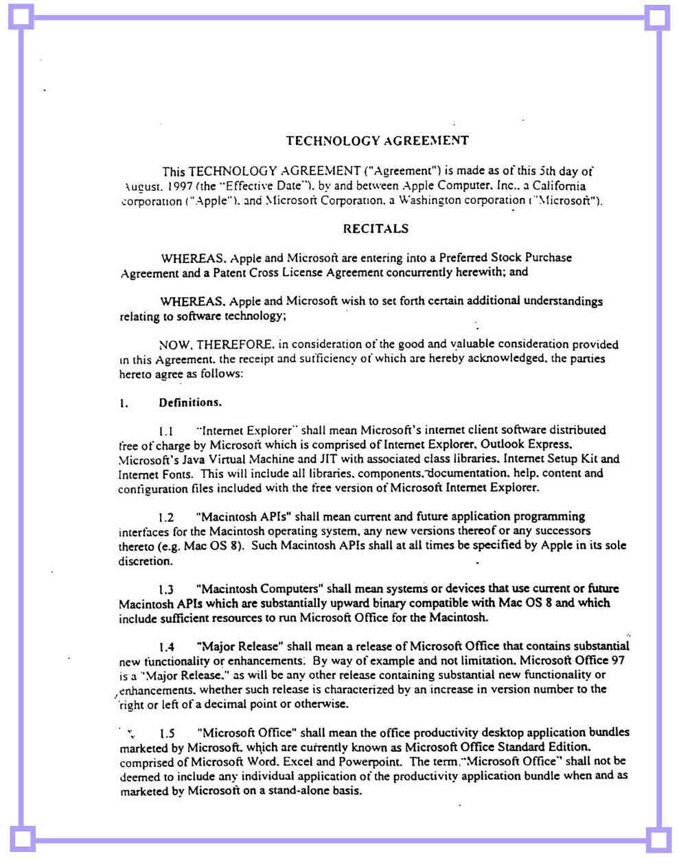 The public deal included a complex web of commitments: patent cross-licensing, guaranteed Microsoft Office development for Mac, Internet Explorer as the default Mac browser, Java compatibility, on top of the lawsuit settlements.