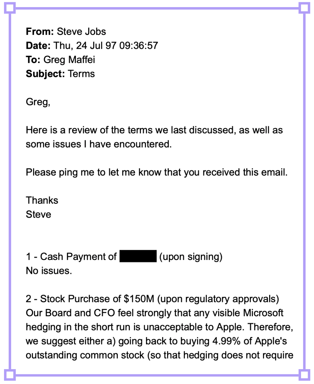 Apple was losing $1 billion annually, with “less than 90 days of cash left”, but they weren't negotiating from weakness.
