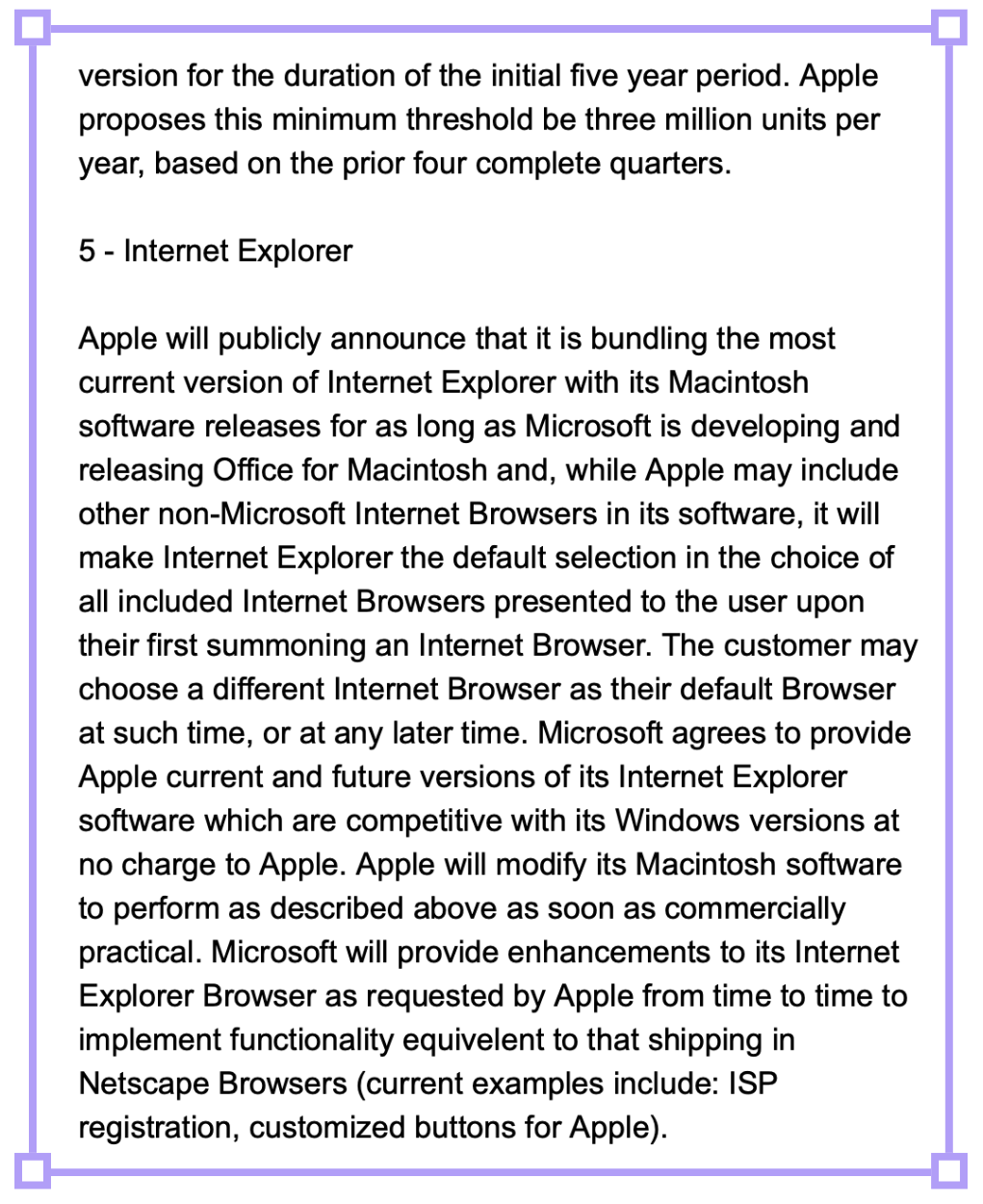 The IE provision later came back to haunt Microsoft. During the 1998 antitrust trial, DOJ prosecutors specifically cited this as anticompetitive: "Microsoft, by threatening to cease development of its Office for Macintosh productivity suite, coerced Apple into making Internet Explorer the default browser on all Macintosh operating systems."