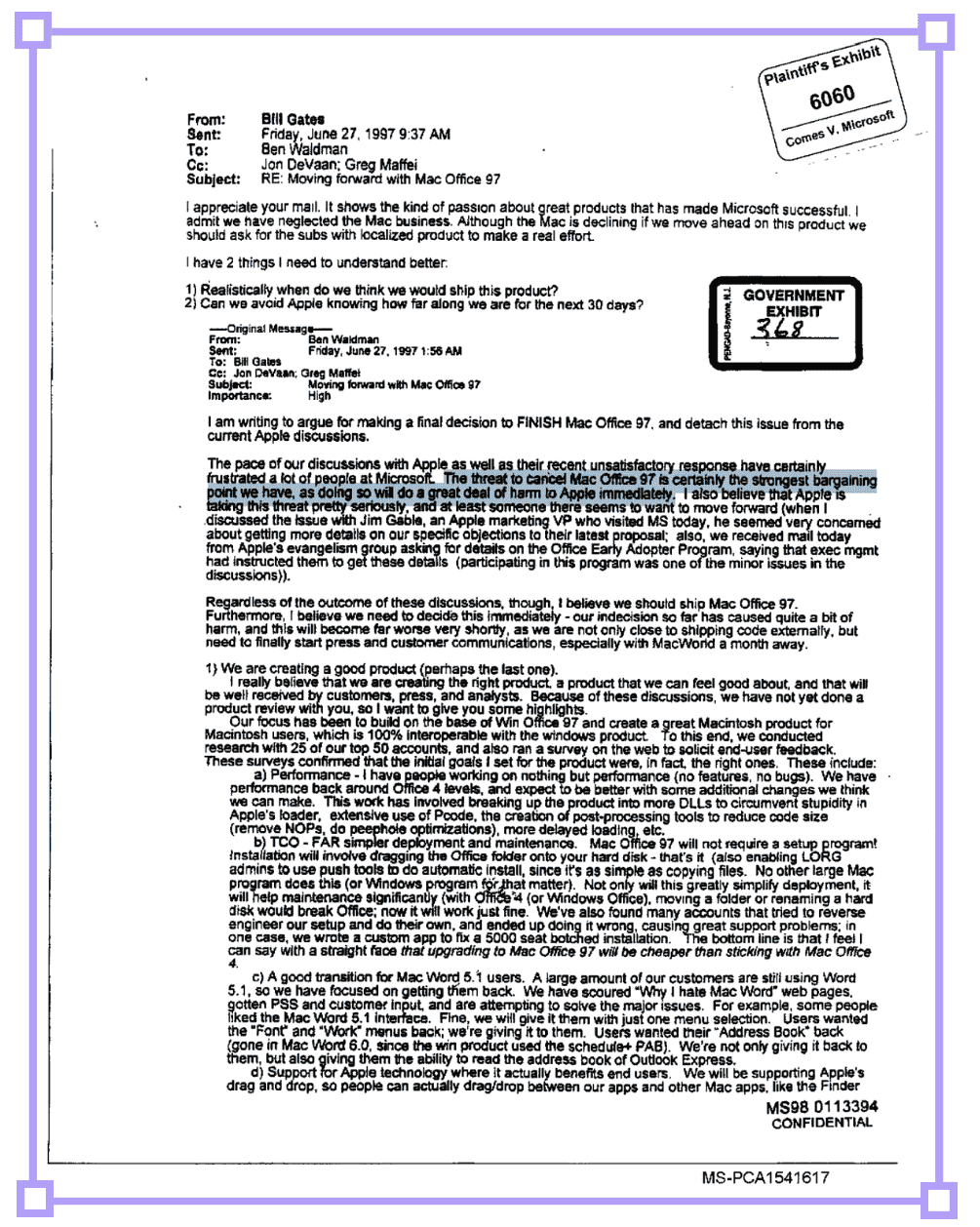 "The threat to cancel Mac Office 97 is certainly the strongest bargaining point we have, as doing so will do a great deal of harm to Apple immediately." (VP Ben Waldman to Gates, leaked 1997 internal Microsoft email).