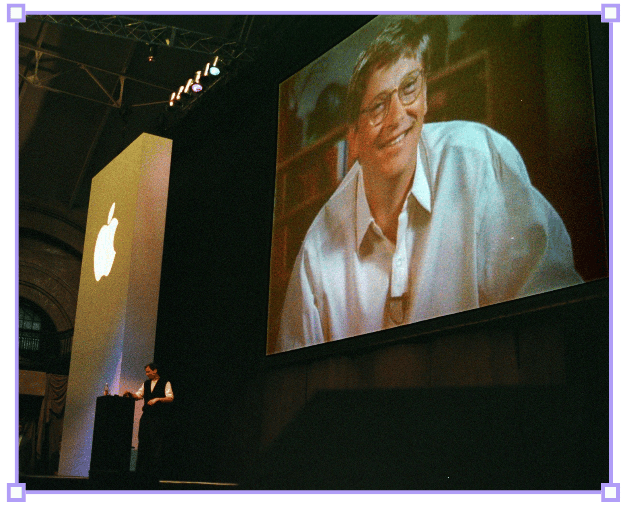 In August 1997, Bill Gates's face appeared on a massive screen at Macworld Boston, looming over thousands of diehard Apple fans.