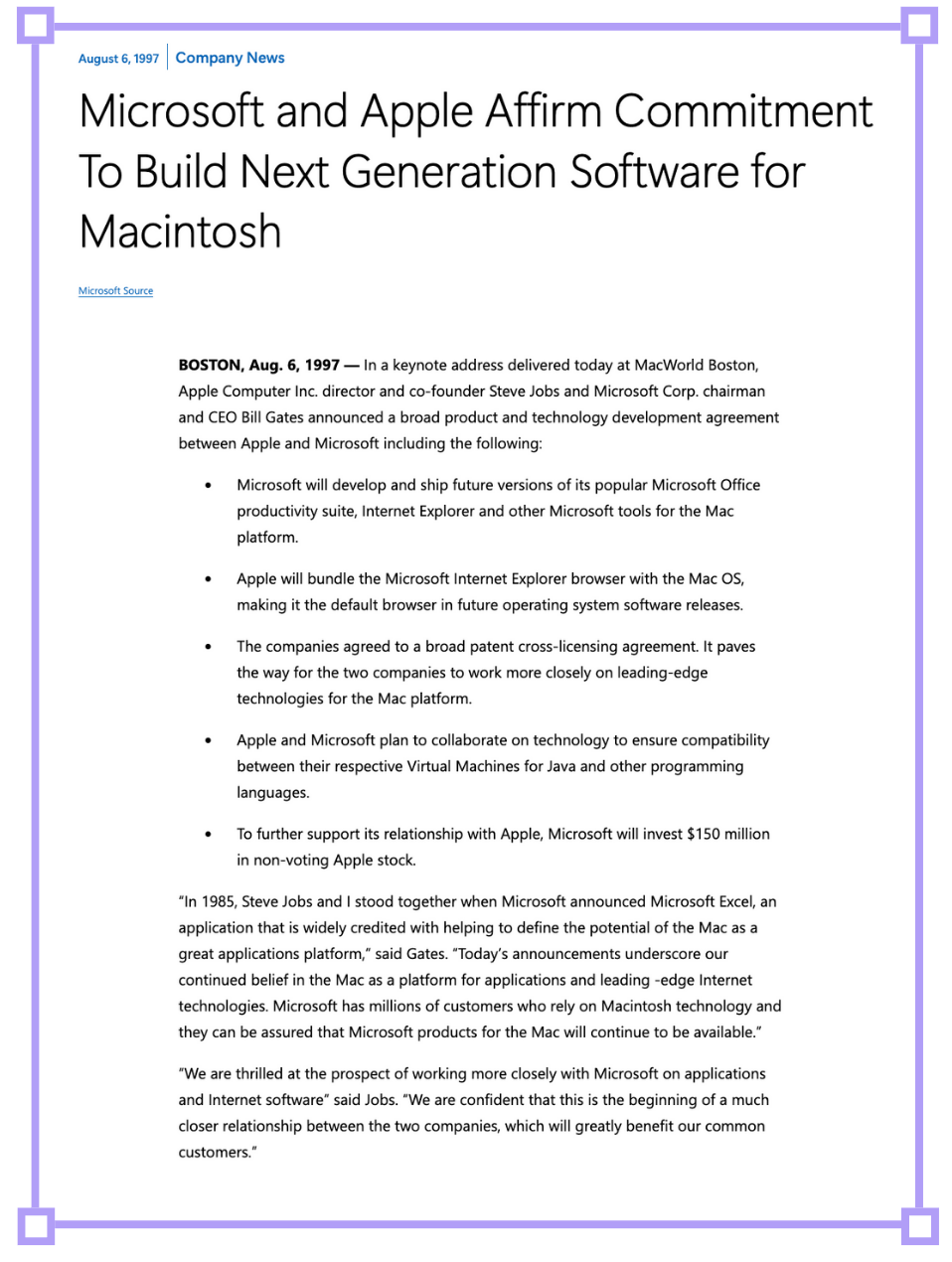 A peculiar 1997 deal between Microsoft and Apple that seemed to lay the groundwork for the next 20+ years of dominance for both companies.