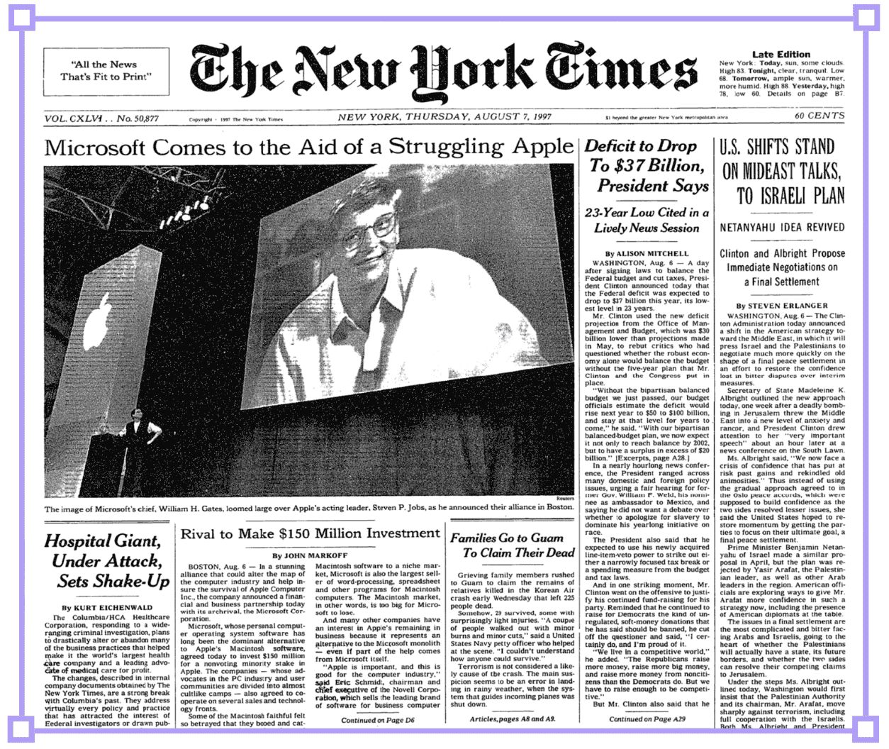 Tech headlines proclaimed Microsoft had saved Apple from bankruptcy.