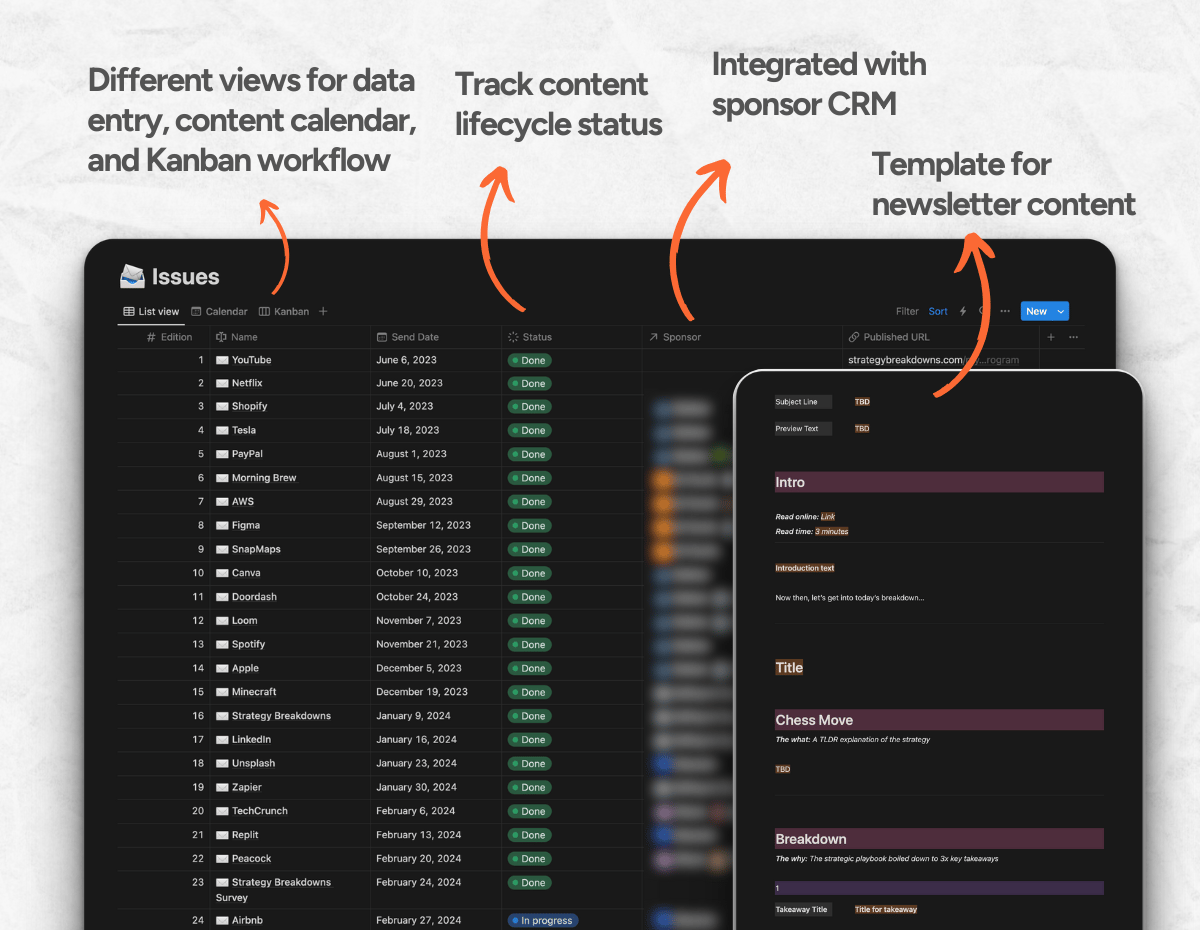 When someone becomes a newsletter sponsor, we generate a custom Notion portal with key campaign information, pretty performance reports, collaboration spaces, and FAQs to instantly kick things off with trust and momentum.