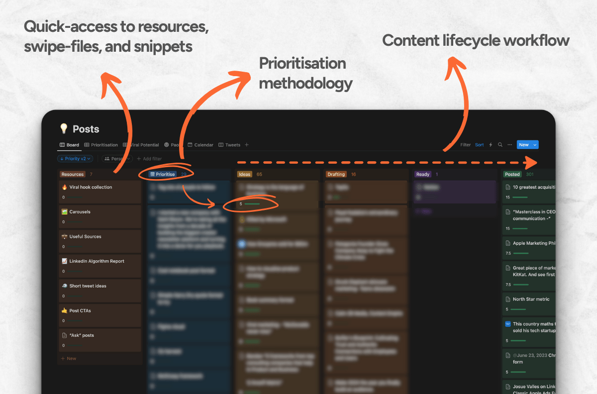 Social content system for ideating, prioritising, writing, editing, and posting content every day on LinkedIn and Twitter.