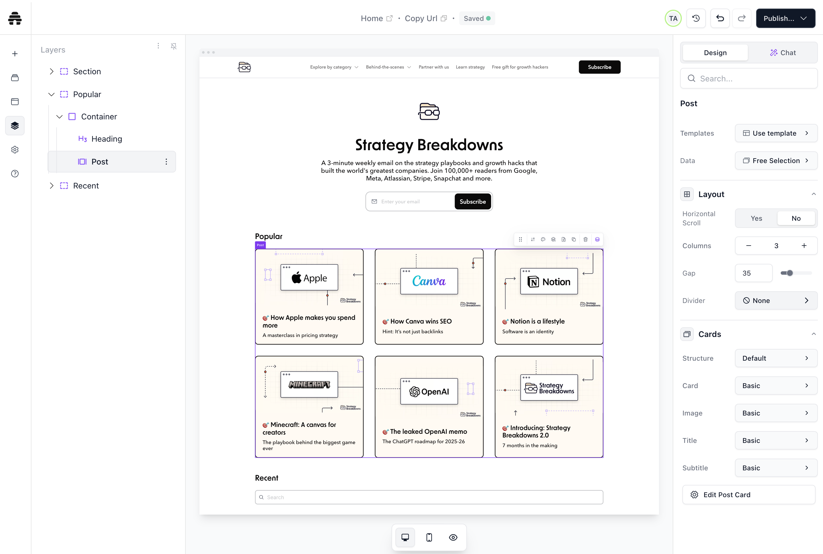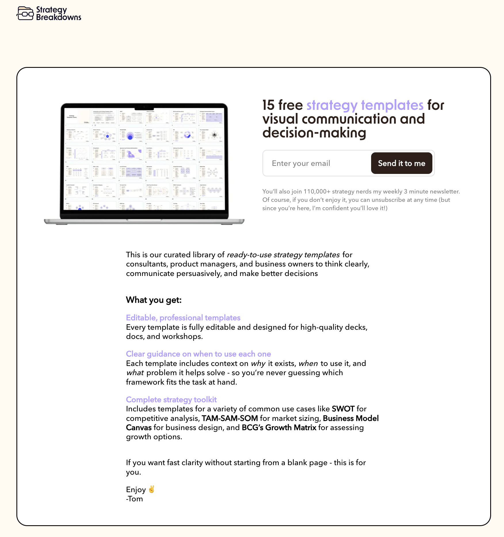 The result is a consistent design system across emails, website, landing pages, and every touchpoint along the reader journey. Strategy Breakdowns feels like one cohesive brand, because it all lives in one platform.