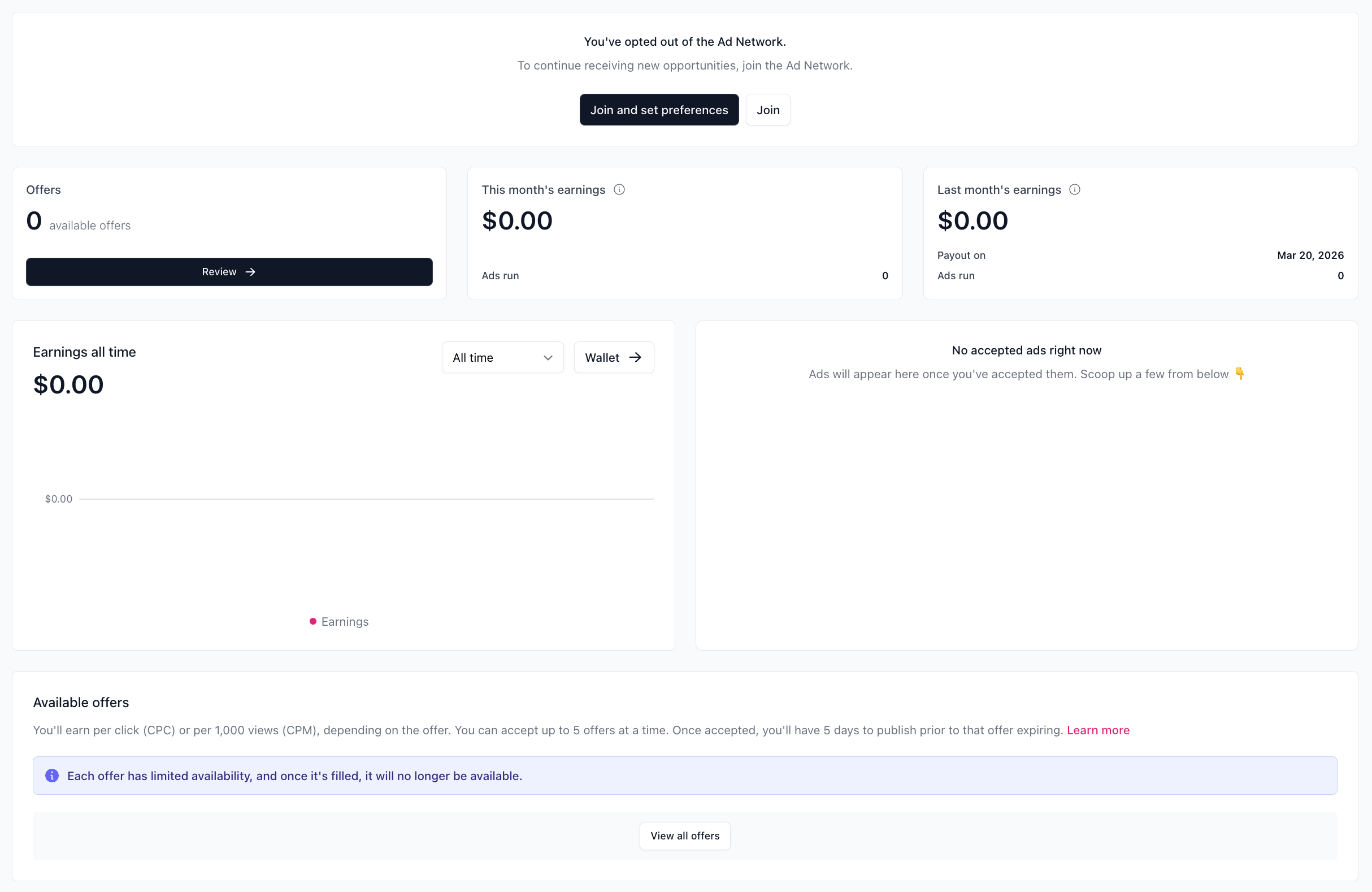 Ad Network - on-demand sponsored placements, ready when you are. You don't need to sell ads yourself - they match you with brands, handle the creative, and you get paid programatically based on the clicks you drive