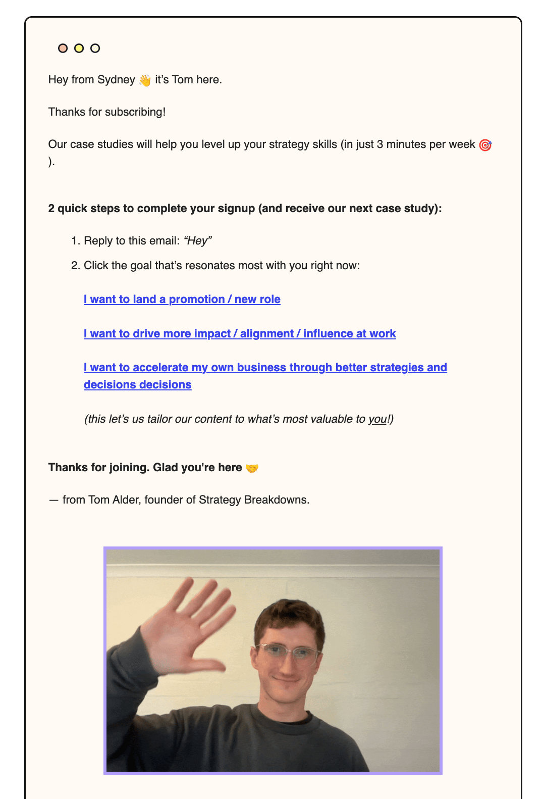 Step 3: Over the next few weeks, new subscribers receive a surprise free strategy crash course, our most popular articles (determined by beehiiv poll data on what readers found most valuable), and a bunch of behind-the-scenes stories and resources.