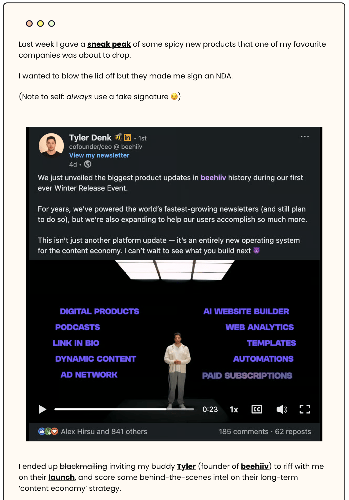 A few weeks ago I was in London for a beehiiv x Google event. Tyler Denk (beehiiv founder + CEO) was presenting on stage.