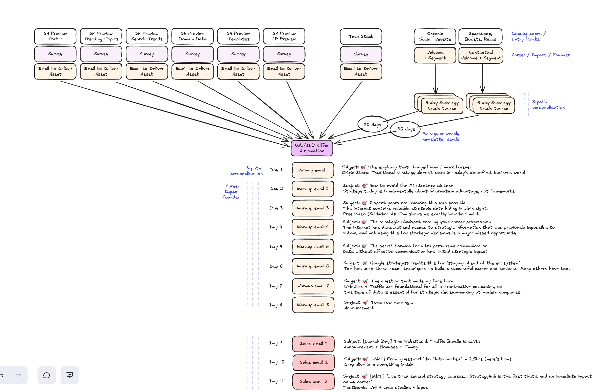 A handful of entry points (landing pages / lead magnets / website opt-ins) that trigger a survey to segment readers into key archetypes, plus delivery of contextual email(s), then they all aggregate into…